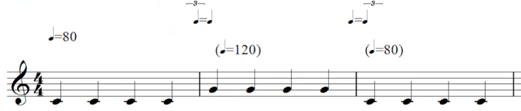 Another way to write this would be to literally change the tempo halfway through the phrase by using metric modulation. Here’s what that would look like: